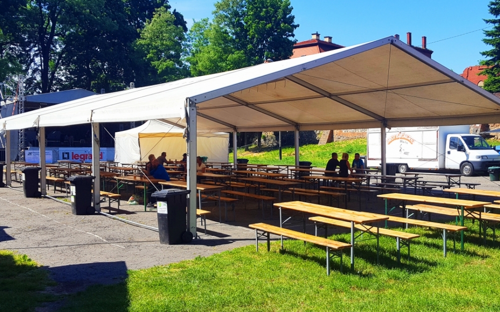 Namioty o konstrukcji lekkiej rurowej Wymiary: 5m x 8m oraz 6m x 12m Wszystkie namioty posiadają boczne ściany |